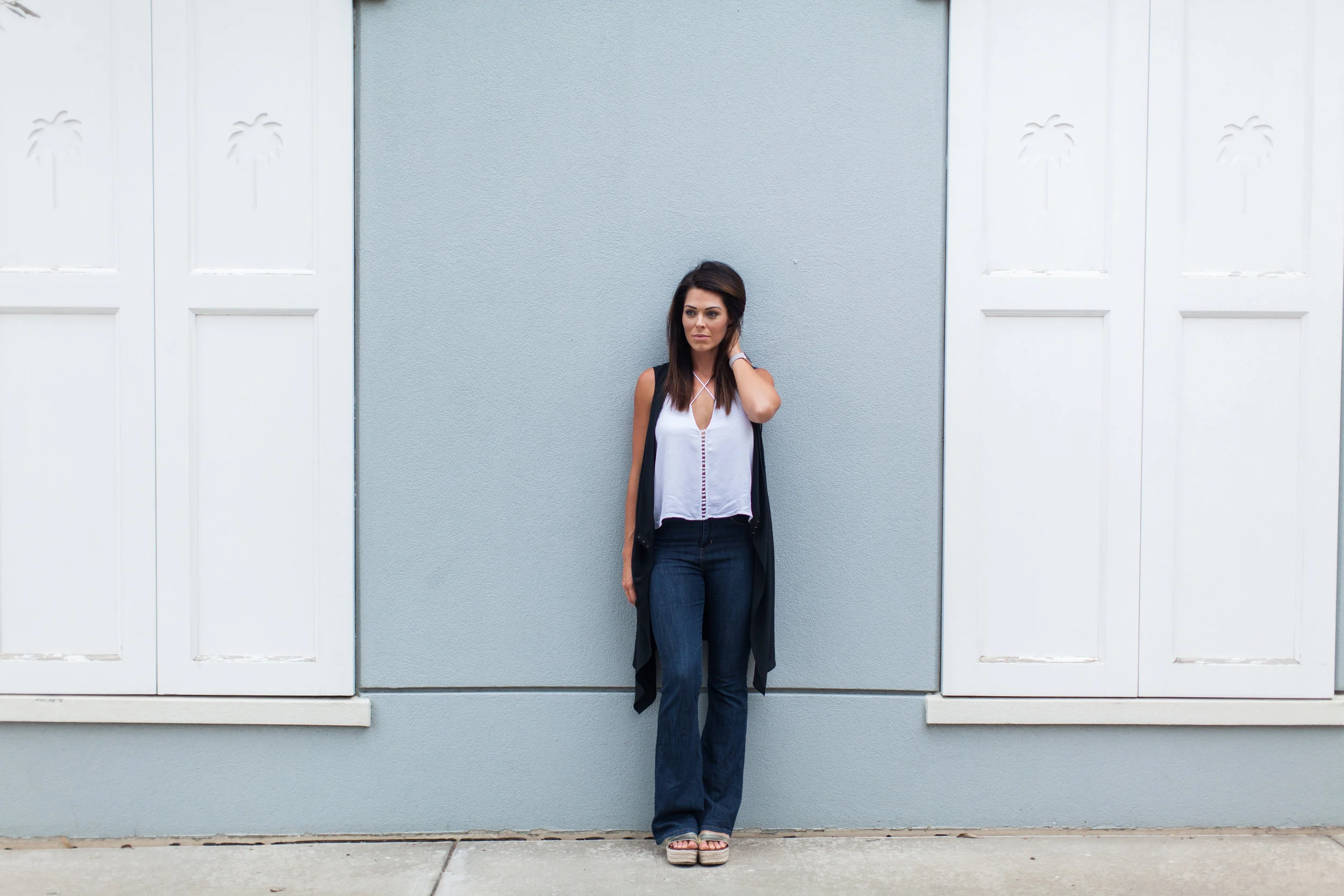 I also styled the white tank with wide leg jeans and a black sleeveless duster. This is still casual but a dressier version than shorts. I kept the same shoes. This would be great for dinner with friends or any casual evening.